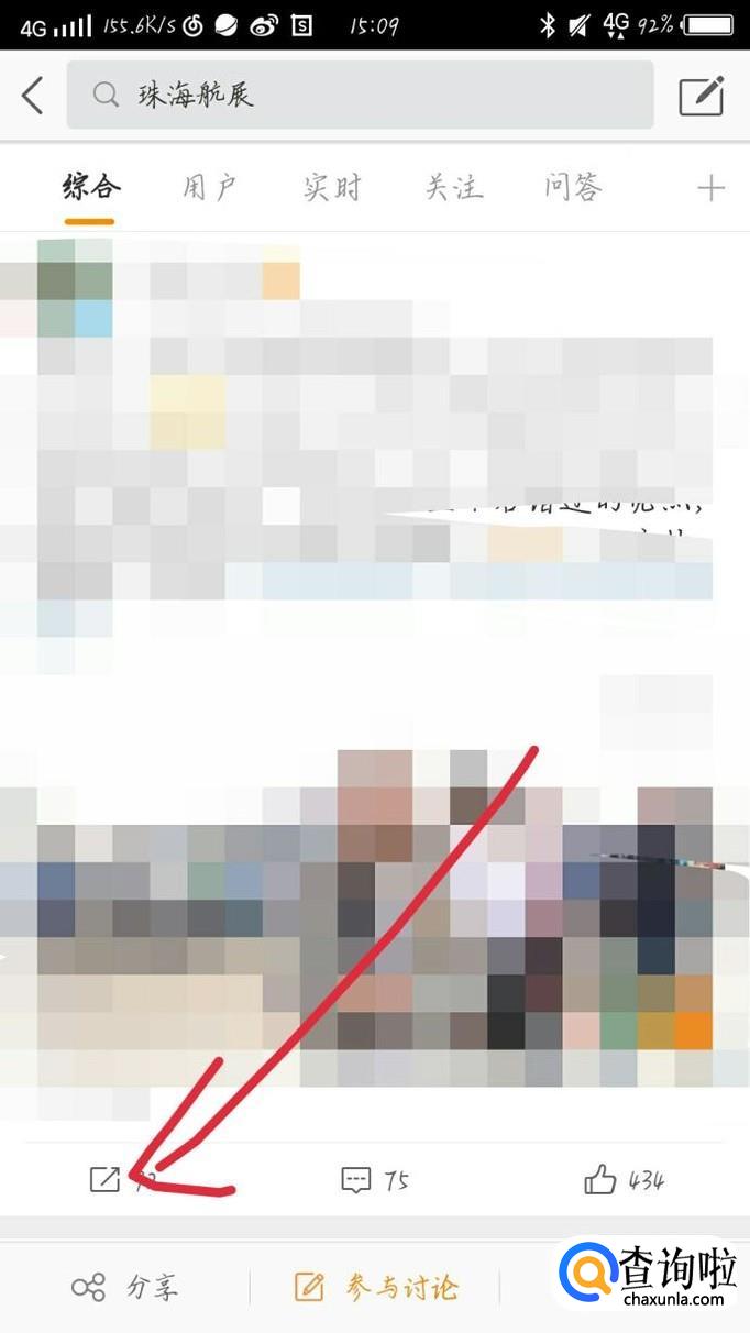 如果你想要转发一条微博,点击左下角“转发”图标,如图1箭头所示。你会看到出现一个新的界面,如图2所示。