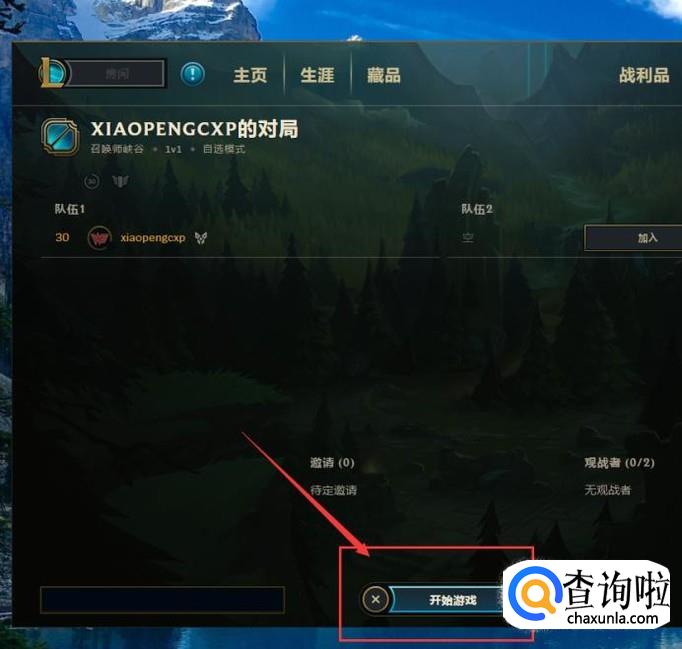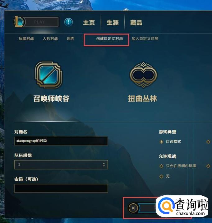 由于这里是教程,所以我以游戏自定义模式为例,点击“创建自定义对局”按钮,然后点击“确定”按钮。