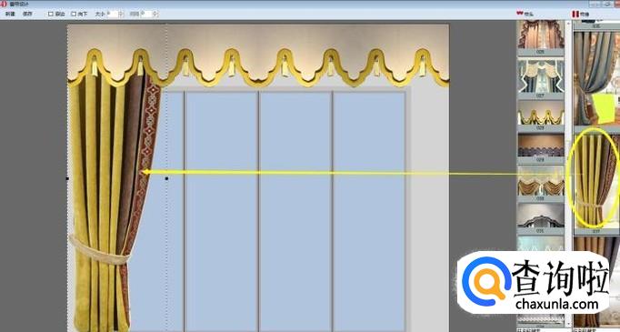 帘身。再次设计帘身,选择合适的帘身,单击后帘身自动铺贴窗户左侧,可通过鼠标拖拽,将右侧帘身添加上,双击帘身可调节其大小;