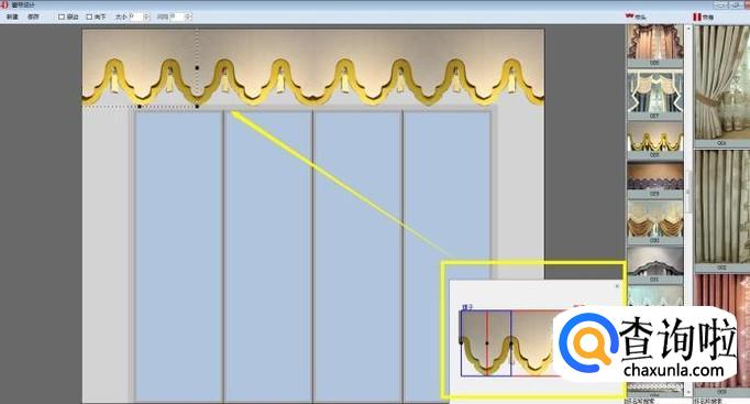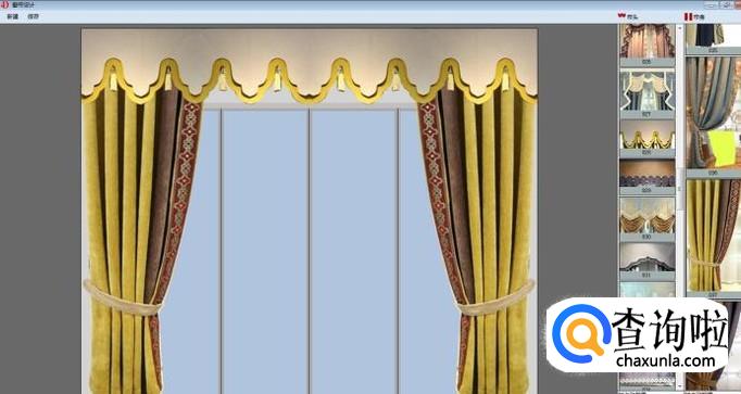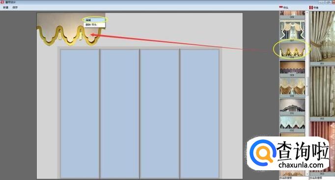 帘头。首先设计帘头,选择合适的帘头,单击后,帘头自动铺贴窗户上,但只有一部分,再右击帘头选择“满铺”即可,双击帘头可对帘波及旗子进行调整;