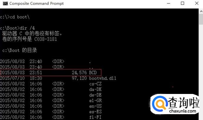 再找到BCD 和BCD1两个文件,接着删除BCD,更改BCD1的文件名为BCD,然后退出重启;“删除命令:del BCD”、"重命名命令:ren BCD1 BCD",这样就应该可以进入系统了。