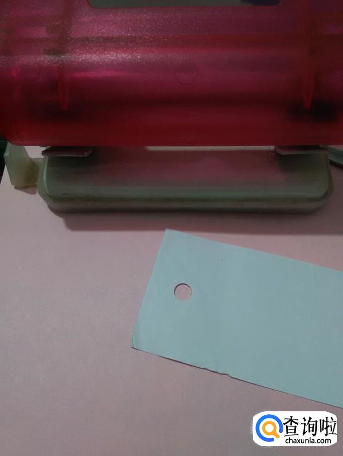 用打孔器在长方形的一端打一个孔。