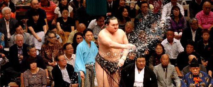 如今相扑比赛前进行的「撒盐」、「尘」、「四股」、「蹲踞」四项仪式,来自于神道教的宗教仪式。赛前撒盐除了驱邪,还有向神祈祷,保佑自己不要受伤之意;「尘」,即「尘水手」之意,表示自己没有带任何武器上场;「四股」乃是以双脚轮流顿地,藉由力士威武的身躯,来镇慑躲藏在地底的邪灵;「蹲踞」指脚掌尖着地,双膝外张、上身挺直、稳腰并将双肩放松,将手放在膝盖上,表示尊重对手之意。
