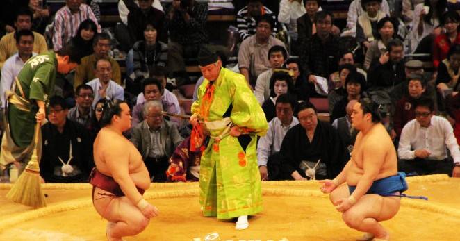 相扑,指两人在土表中角力的一种格斗技,是一项日本传统体育运动。比赛时近乎全裸的两个大胖子在直径4.55米的圆形土俵上进行角逐,巨人相撞,极富戏剧性。