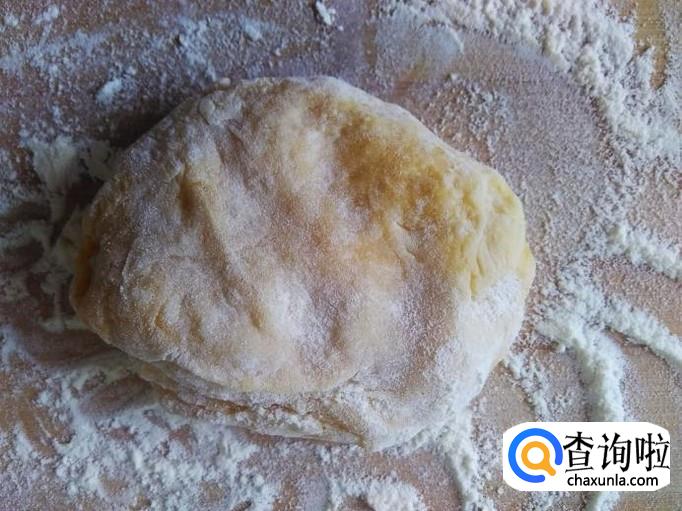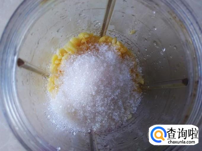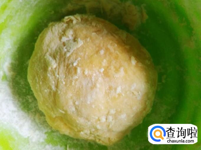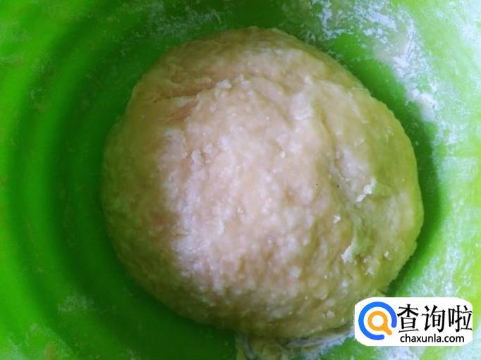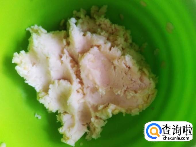 然后拿出来倒到打浆机加适量的白糖打成粉团,倒到盘子里备用。