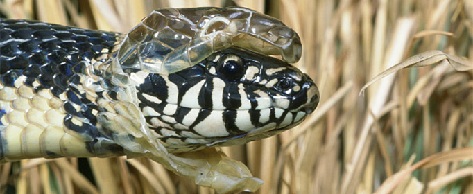 蛇蜕皮有周期性,大约每年可以蜕3~4次。蜕皮的过程颇为有趣,一般是先从上下嘴唇脱起,随后头部皮肤松脱开,这时便和人们脱长筒袜子一样,把头部已脱落的皮翻转向外,借助粗糙的地面或岩石缝,或树枝的杈口,从头部往躯干部慢慢脱下来,最后从尾部末端把整个旧皮蜕掉。