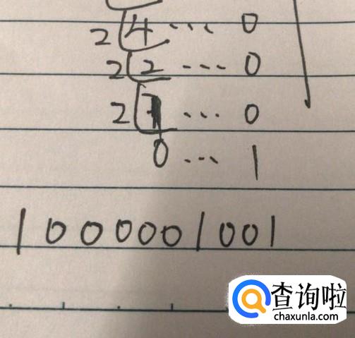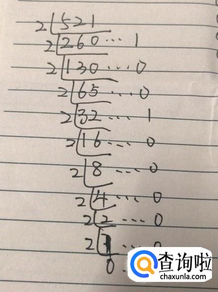 将十进制转化成二进制时,需要除二取余法,因此可以进行除二,如果数位比较多的话,可以进行如图所示进行除法运算。