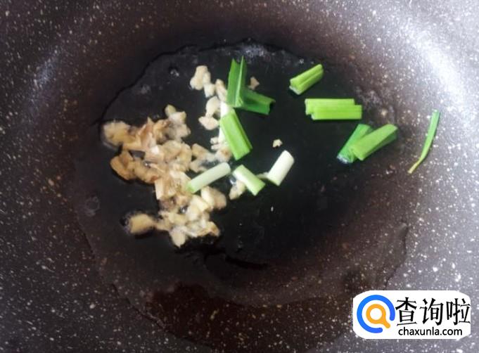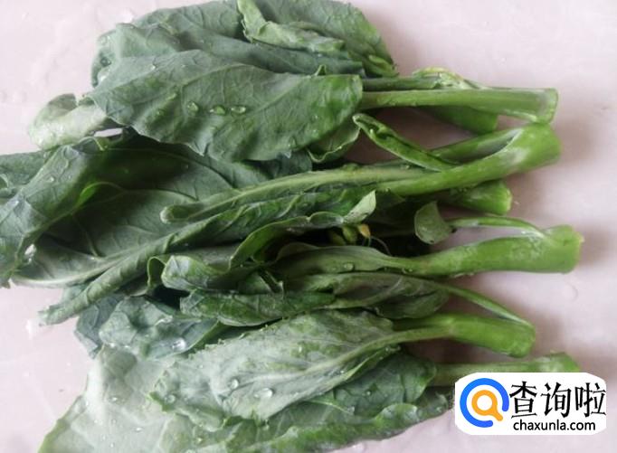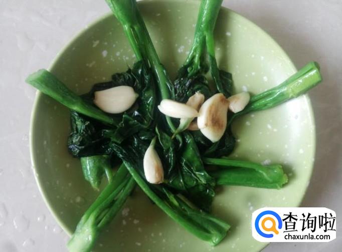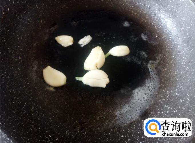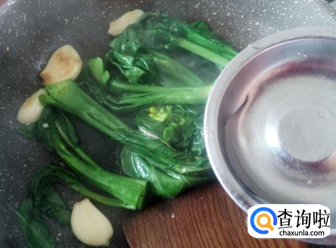 开火下油,放蒜米进去爆出味来,然后芥兰下锅,加适量的盐。