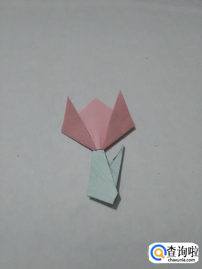 把叶子的尖部插入花朵下面的小孔中,一朵漂亮的郁金香花就折好了。