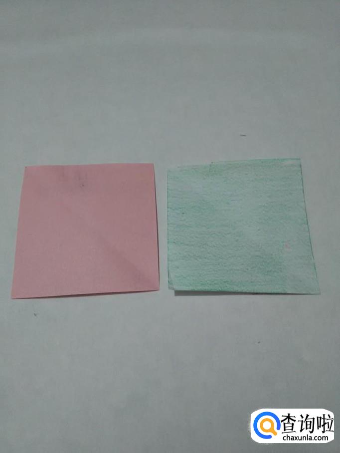 准备两张一样大的正方形彩纸,一张粉色,用来折花朵,一张绿色,用来折花叶子。