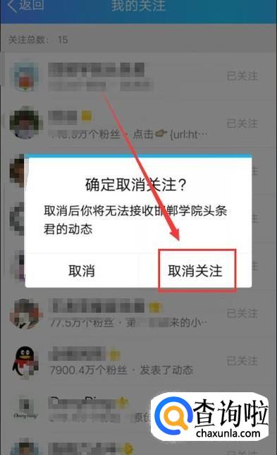 点击关注人右侧的“已关注”即可弹出“确定取消关注”界面,点击“取消关注”即可,如图所示。