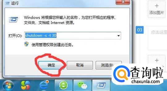 在电脑左下角打开运行,输入“shutdown -s -t 30”确定,在1分钟内电脑即可关闭;
