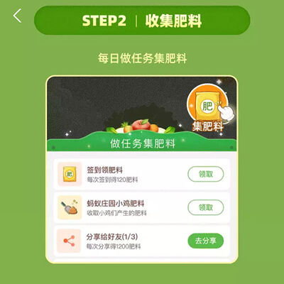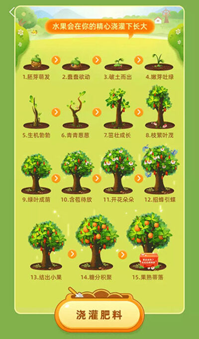 2、芭芭农场种水果一共是分15个阶段,这15个阶段分别是“胚芽萌发,蠢蠢欲动,破土而出,嫩芽吐绿,生机勃勃,青青葱葱,茁壮成长,枝繁叶茂,绿叶成荫,含苞待放,开花朵朵,招蜂引蝶,结出小果,糖分积聚以及果熟蒂落”。