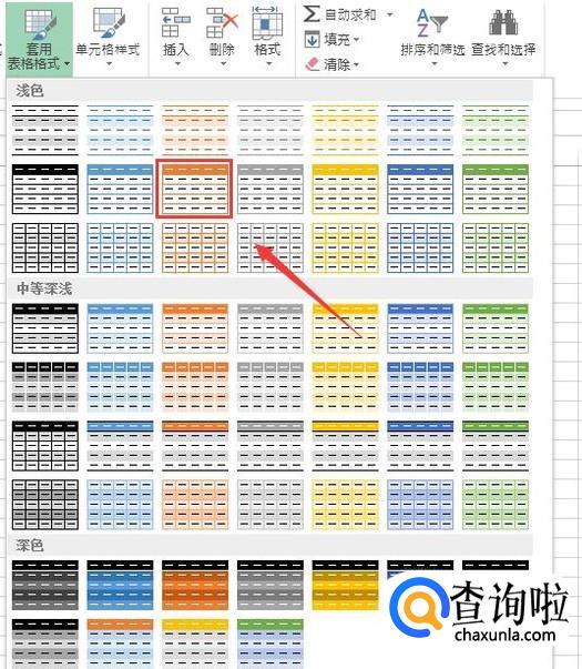点击套用表格格式选项的下拉箭头,在其下拉菜单里需要的表格样式,如图所示: