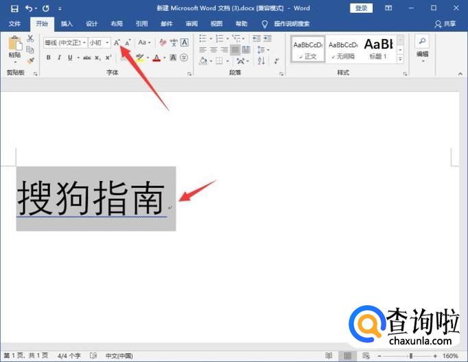 首先选中文本,点击开始选项卡,再点击【增大字号】按钮,可反复点击,直到满意为止,如图所示
