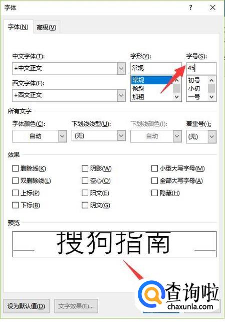 在弹出的字体对话框中,我们选择字体,在字号框中直接输入我们需要的字号大小,再点击确定即可。