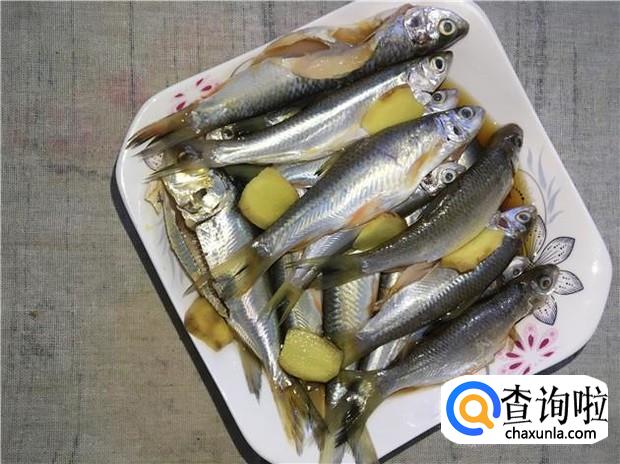 用料酒清洗过的小河鱼,沥干水分,加入适量的盐、酱油、料酒、姜片,再腌制半小时。