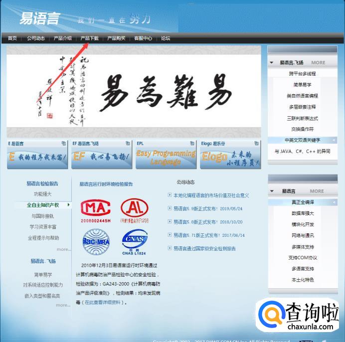 进入到易语言官方网站之后,点击产品下载。