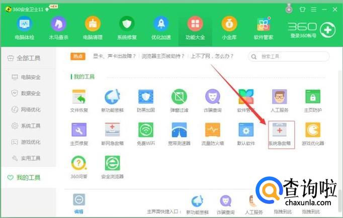 用360软件的功能大全中的系统急救箱,启动系统急救箱,点击进入修复电脑。