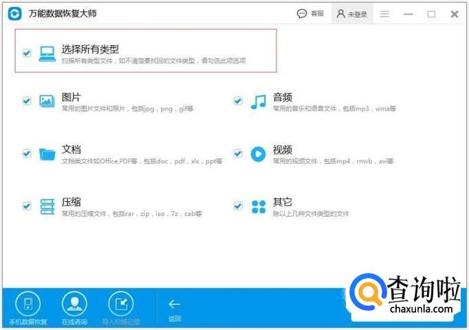 选择要恢复的数据类型,勾选要恢复的文件类型,点击下一步。