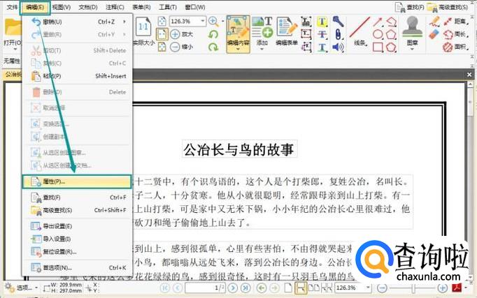 如果我们想要修改文字的属性应该怎么做呢?在界面的左上角找到编辑按钮,点击后在目录中选择属性。