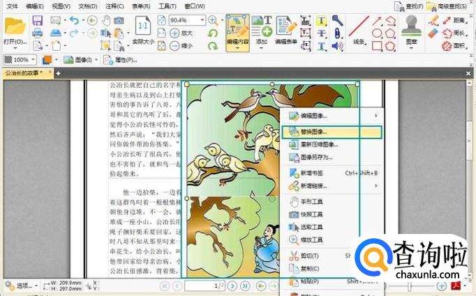 如果我们想要对pdf文件中的图片进行编辑的话就点击图片,当图片周边出现蓝色框线的时候,我们可以移动图片的位置。如果想要用其他图片替换这张图片的话,可以用鼠标右键点击图片,在目录中选择替换图像。