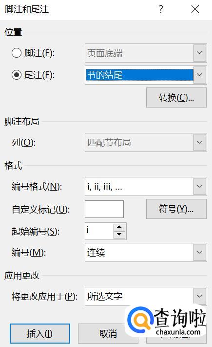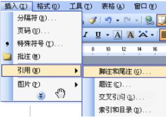 首先把光标移动到需要加入标注的地方。然后菜单中点开“插入”——“引用”——“脚注和尾注”。