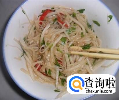 首先咱们要准备一个白萝卜,把它洗干净。把皮削了,然后切丝。这时候我们需要用一个碗把它装着,然后撒点盐,拌匀。