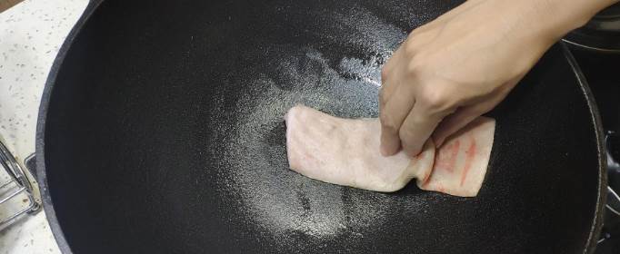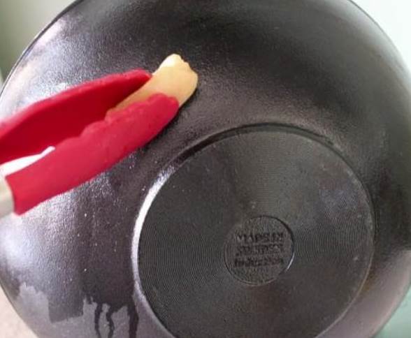 3、准备几块肥猪肉,用夹子或者筷子夹着肥猪肉,边小火加热边往锅边缘擦。一定要反复多次每个角落都擦到。
