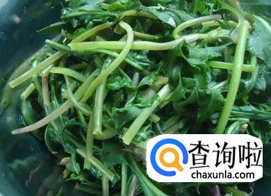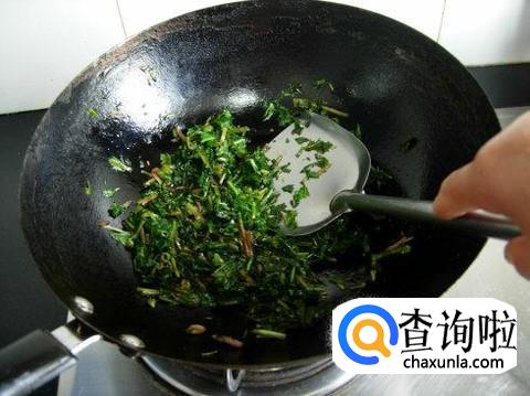 锅烧热,然后,将蒲公英放入进行翻炒。待出水后,将水倒出。继续大火翻炒。