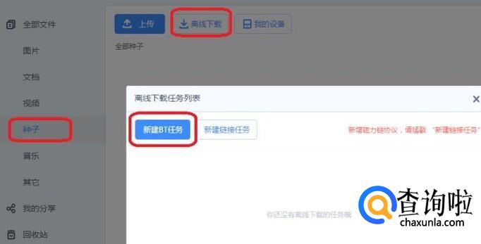 切换到另一界面,我们在该界面点击“离线下载”按钮,弹出选项框中选择“新建BT任务”。