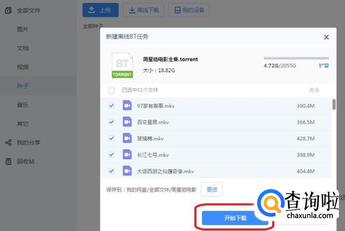 只要添加上BT种子之后,网盘就会自动分析该种子包含文件,您只需点击“开始下载”就可以了,下载的电影会保存到百度网盘里面。