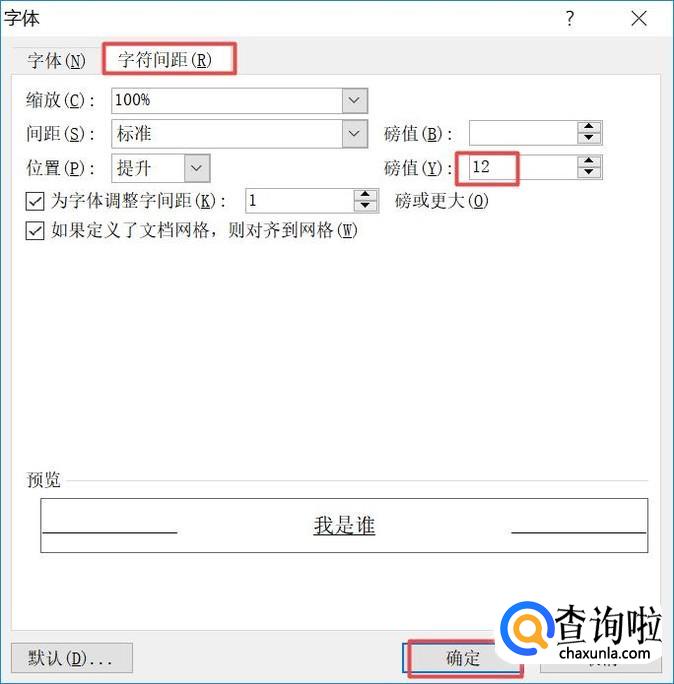 弹出的界面,我们点击字符间距,然后我们在位置中磅值中输入12,之后点击确定;