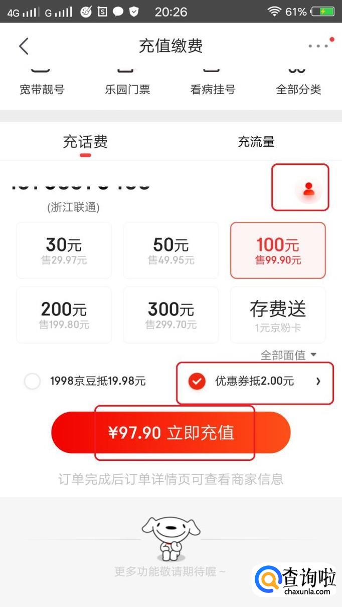 如图所示,选择充值手机号码后,我们选择充值金额100(要注意抵扣券的使用条件,本次使用的券需要充值满90才能使用),然后我们勾选“优惠券抵2元”,点击立即充值,然后付款就可以了。