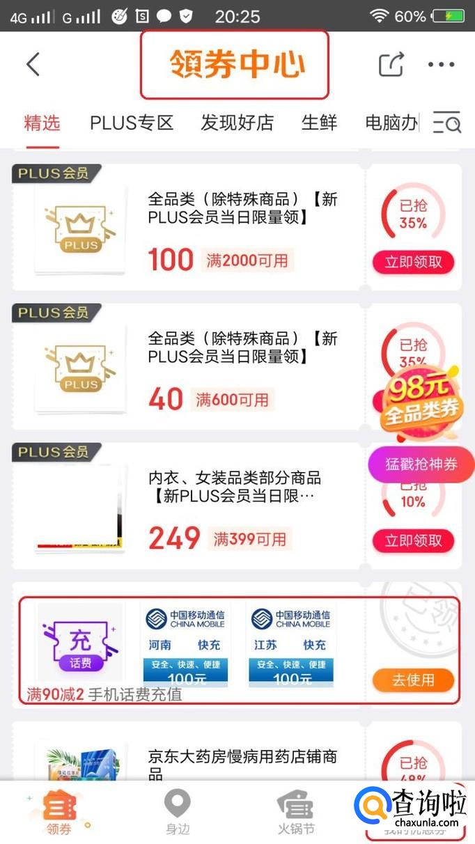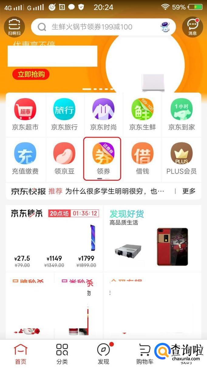 在app首页,中间位置我们能看到一个“领券”的图标按钮,所有优惠券都在里面啦!我们点击打开。