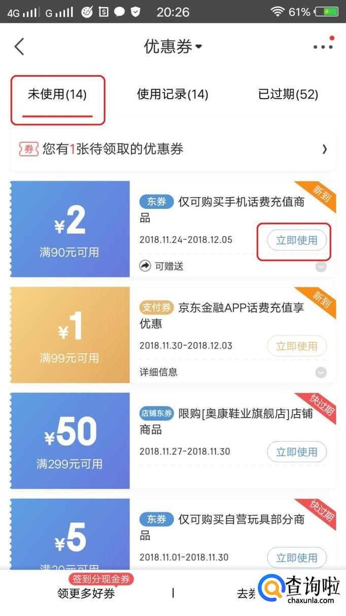 在里面能看到当前京东账号下的优惠券,要使用的话,我们就点击“立即使用”。