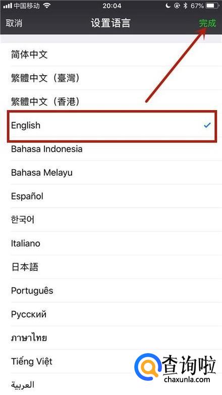 然后点击English并点击完成,如下图所示。