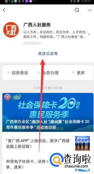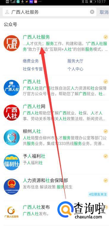 打开微信,搜索“广西人社服务”的公众号并进行关注。