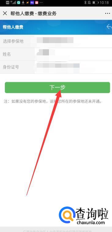 然后输入缴费人的参保地,姓名以及身份号码,并点击下一步。