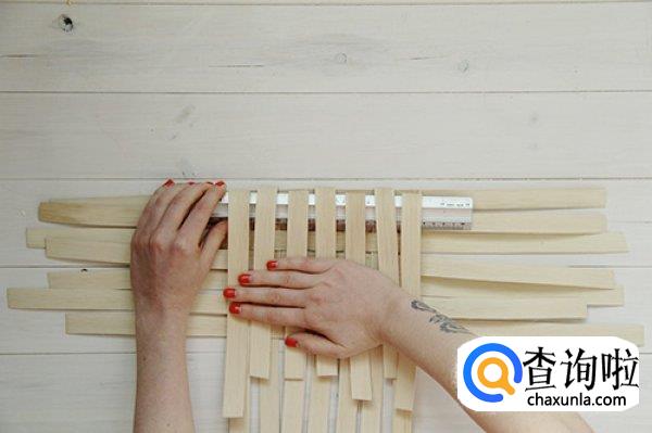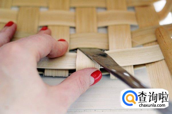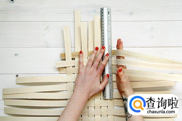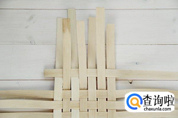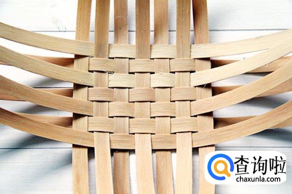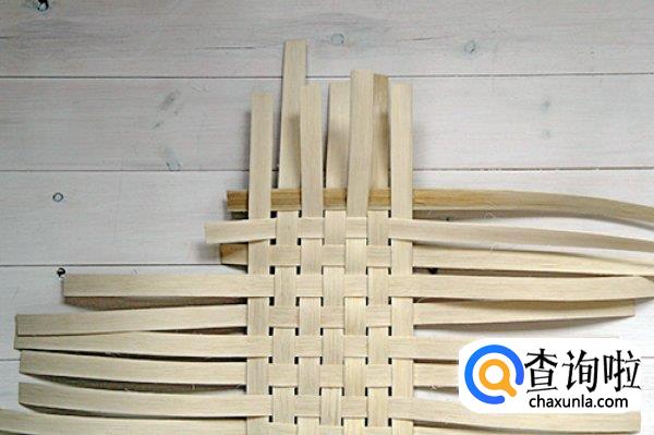 接下来我们取其他裁切好的竹条,开始横向编织,编织的时候要注意是交错进行的,不要被竹条的锋利划伤手。编织成如图所示的样子。