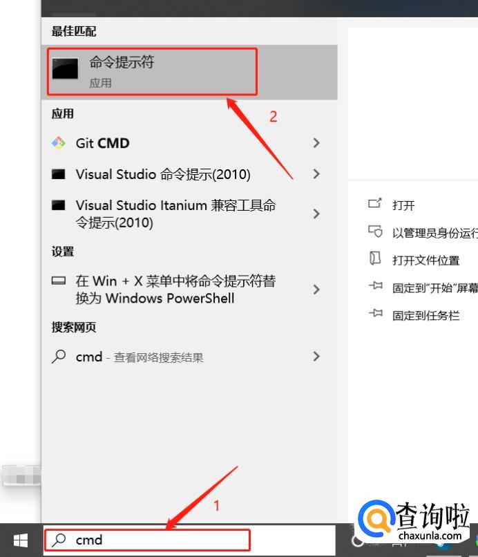在左下角搜索框输入“cmd”,点击“命令提示符”图标选项: