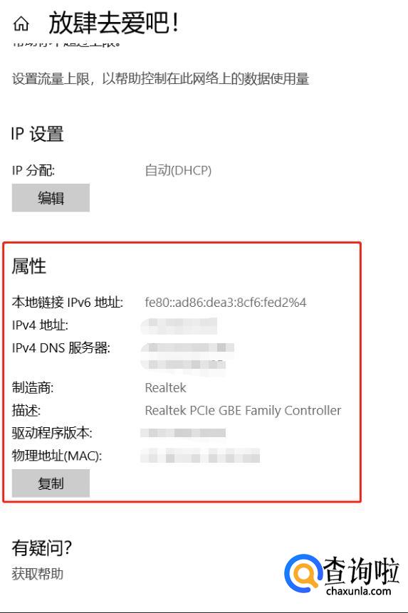 再这个页面往下滑动,可以看见“属性”一栏,红框内就是你电脑的IP地址了: