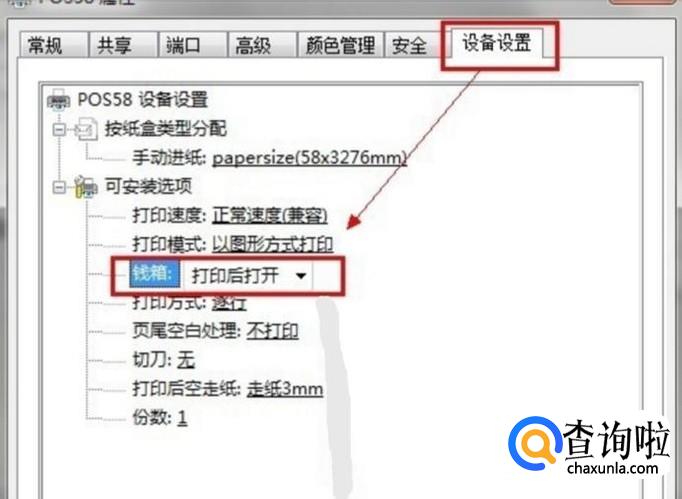 在里面,我们找到设备设置,将钱箱设置成打印后打开即可。