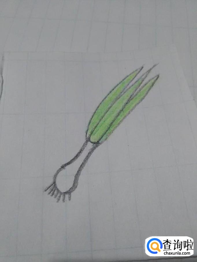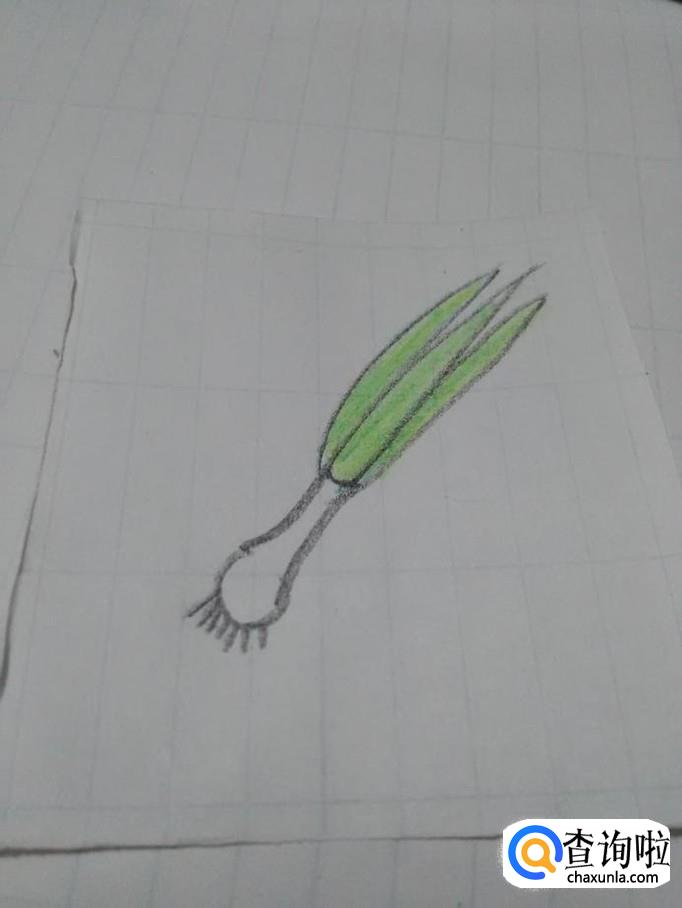 最后用绿色彩笔将三片叶子涂成绿色,蒜苗就画完了。