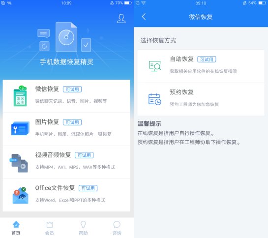 以手机数据恢复精灵为例,在我们误删微信聊天记录之后,我们可以通过应用商店或者浏览器找到“手机数据恢复精灵”,打开该修复工具之后,会看到一系列的修复方法,选择微信修复,然后在自助修复中找到自己需要恢复的微信聊天记录,点击恢复就能够快速的找回手机误删的聊天记录了。
