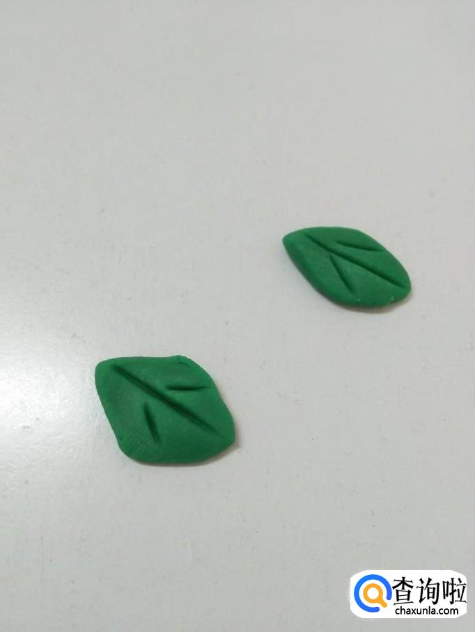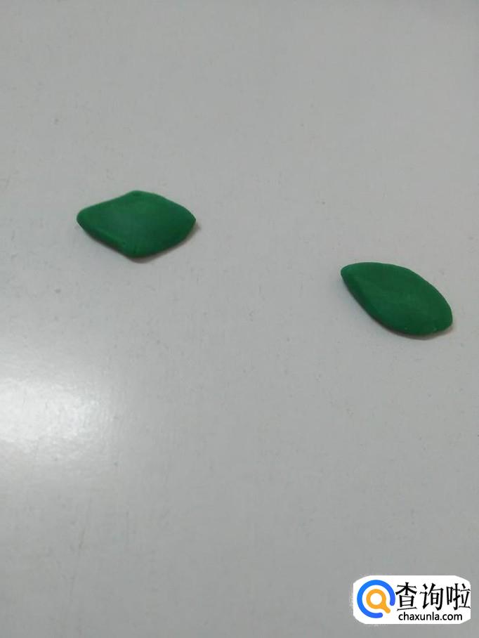用绿色捏两个枣核形状,当作两个叶子,在叶子上面刻一个小字,当作叶脉。