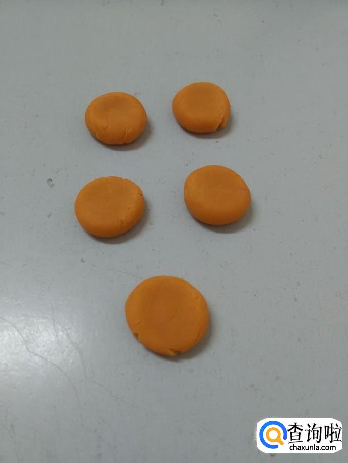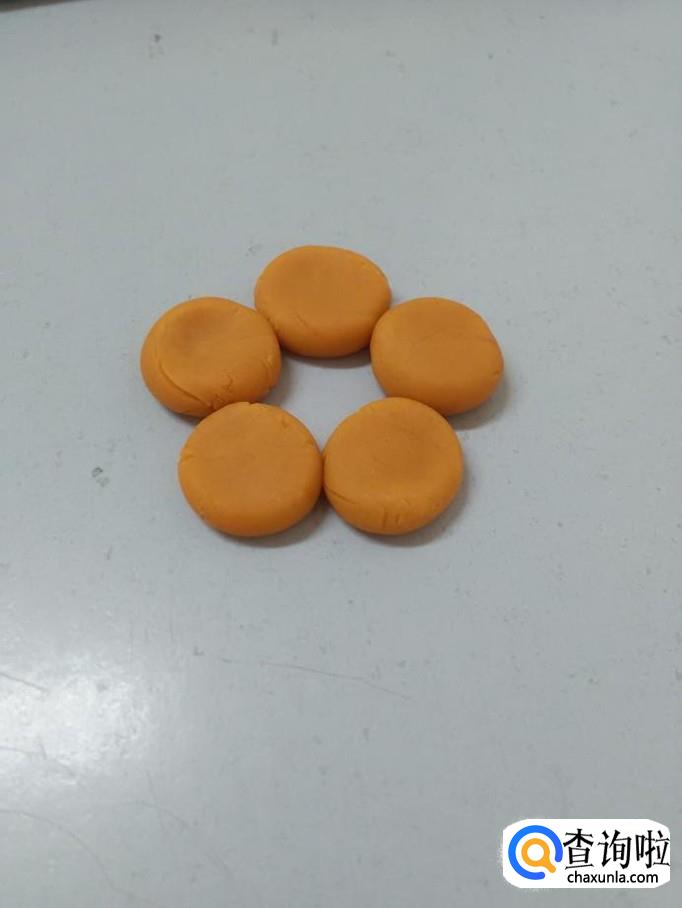 把五个圆球按成扁片,围成一朵花。
