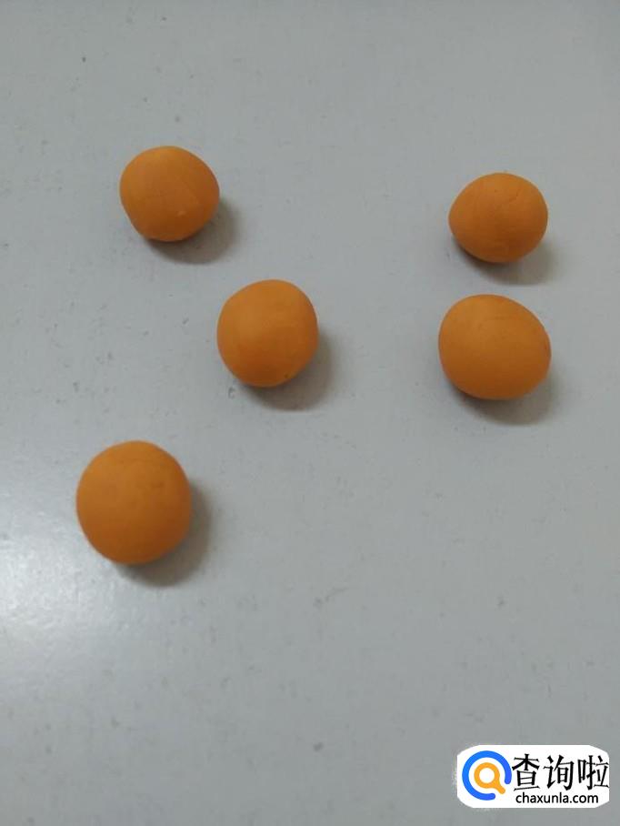 把桔黄色长条分成一样大的五块,然后把五块橡皮泥团成圆球。