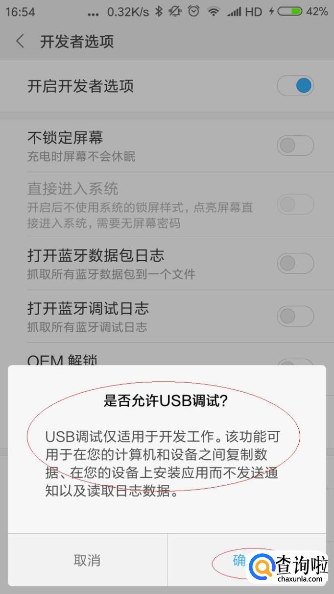 如图所示,唤出"开发者选项"界面。打开"调试→USB调试"项控制按钮,弹出对话框点击"确定"按钮。