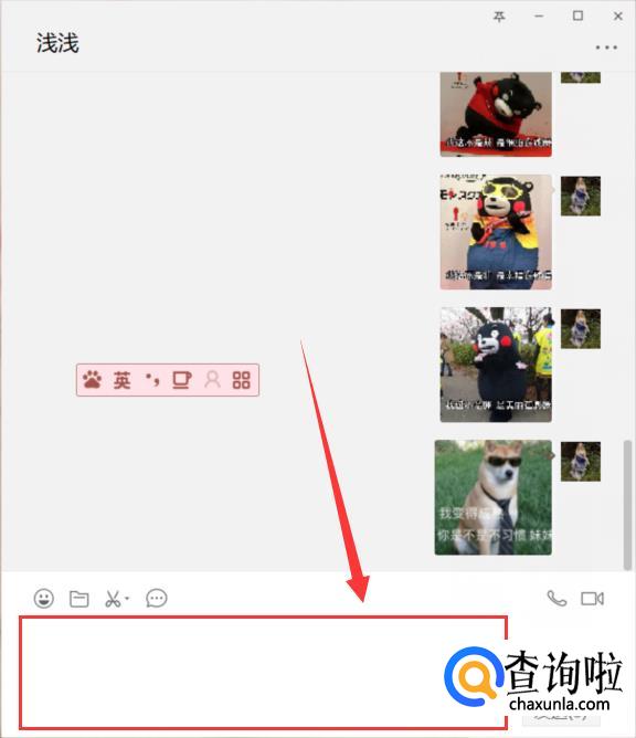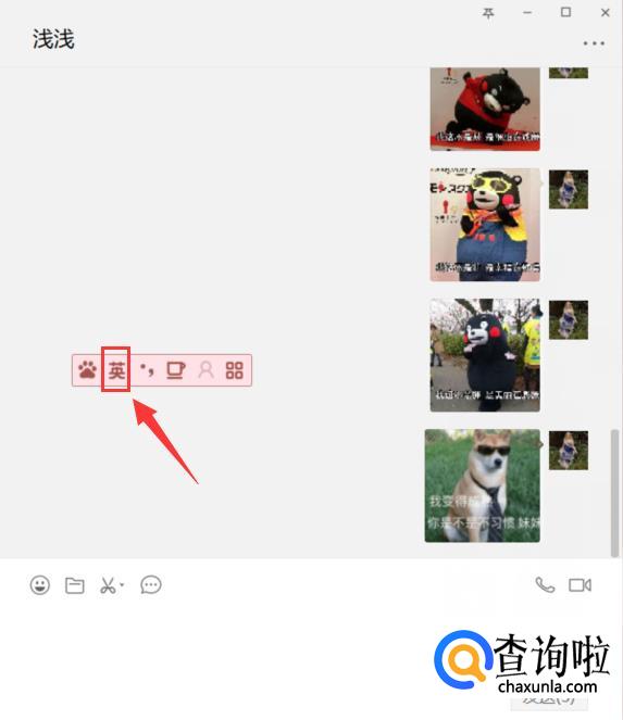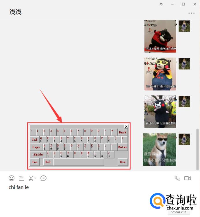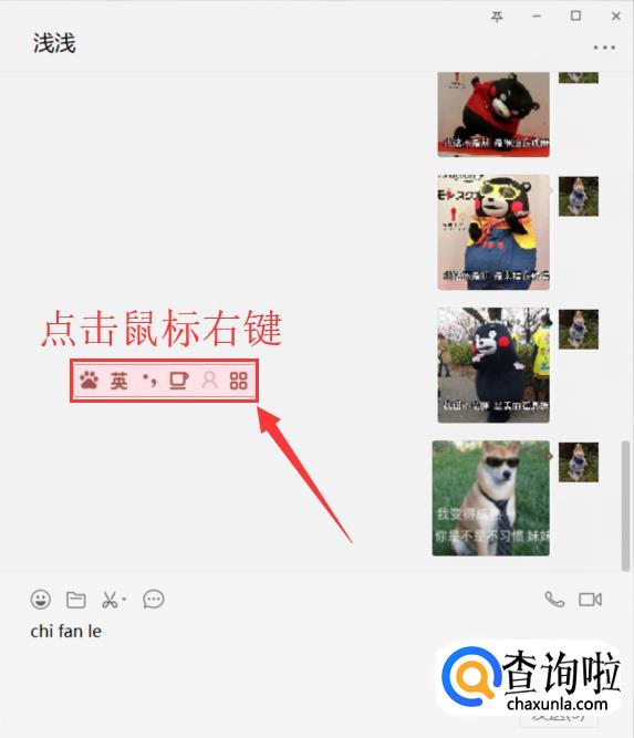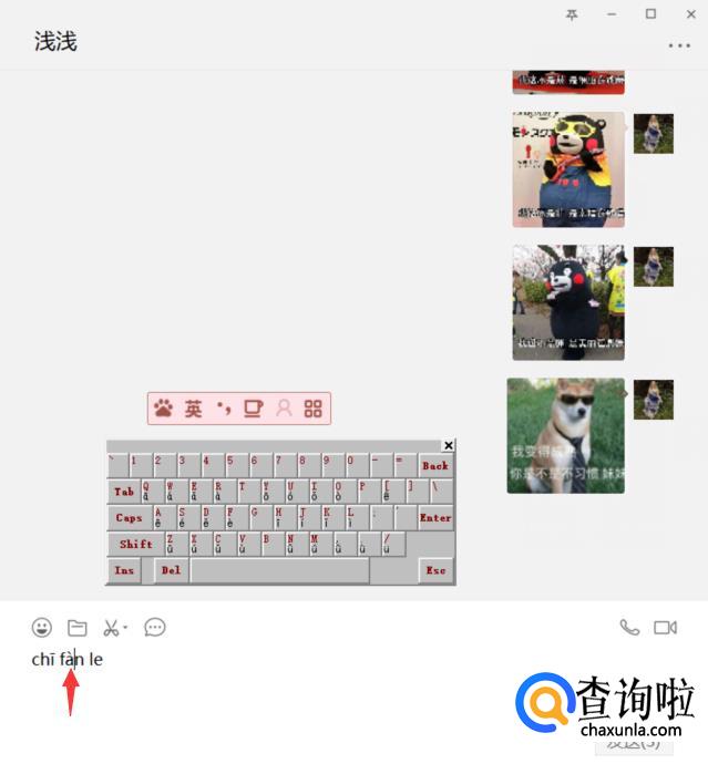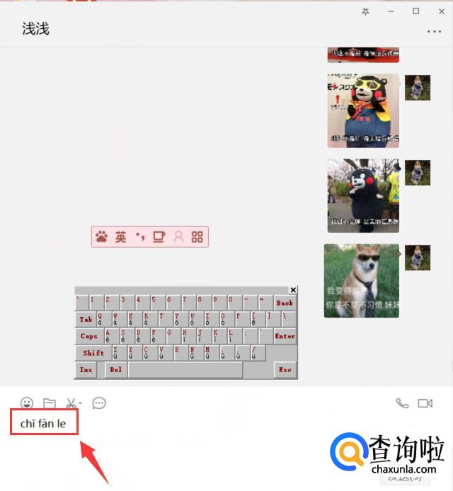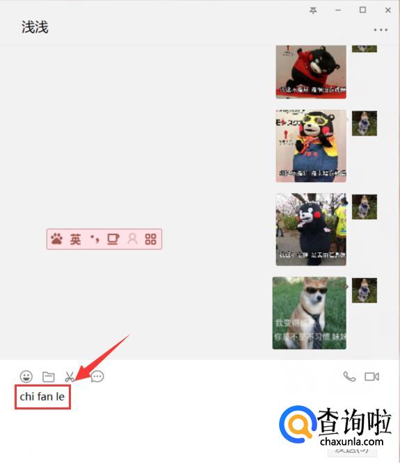然后我们点击聊天窗口,输入任意你想要输入的拼音,比如小编就在这里输入【chi fan le].